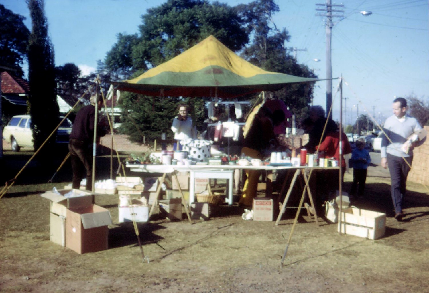 15. Saturday shop set up on Pennant Hills Road. Goods sold here were made by people in the congregation as part of a talent scheme to raise funds for the new building.